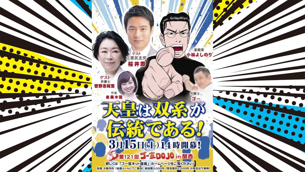 その動きを力強く進めるにあたっての、関西での「狼煙」が、3月15日(土)に大阪で開催の第121回 ゴー宣DOJO「天皇は双系が伝統である!」です!