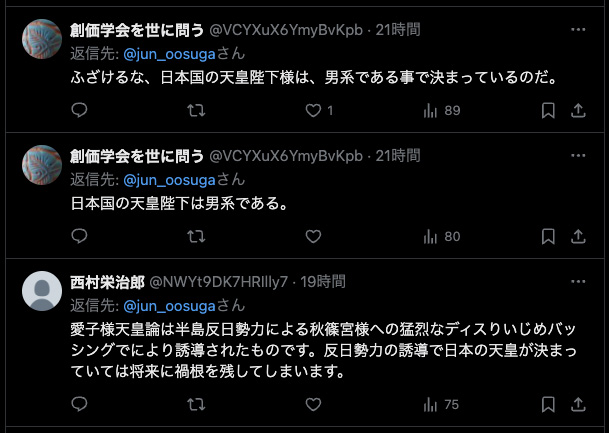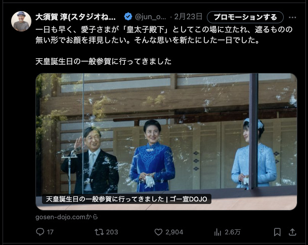例えば、一昨日の一般参賀について書いたブログをXで共有した際、このように愛子さまの立太子を強く望むコメントを添えました。この記事の執筆時点で2.6万回表示され、約2900の「いいね」が付いています。