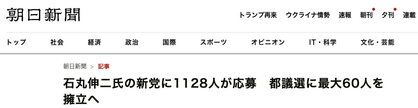 石丸伸二の立ち上げた地域政党「再生の道」の都議選候補募集に、1,128人の応募があったそうです。
