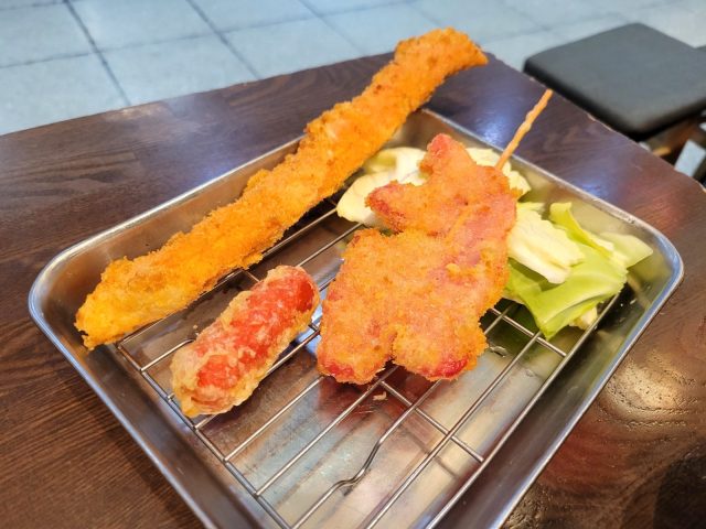 大きなカニ風味の練り物を油で揚げたものと、真っ赤に染まったショウガを上品にフライにしたものですね。ソースをつけていただきます。
