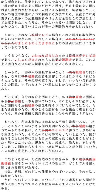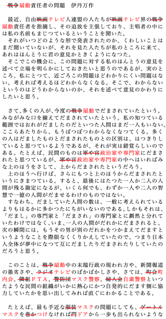 実は(旧)『コロナ真理教に人々』を最初に企画した時は6回、ないし12回分の想定でした。どれほど採用していただけるか分かりませんでしたし、ひとまず趣旨を6回にまとめ、実例を含め12回までは原稿を用意し、原則的に一回ワンテーマでボツがあっても不都合がないようにしていたのです。そしてその最終回の最後に取り上げたのは伊丹万作さんの『戦争責任者の問題』でした(旧シリーズ⑫)。それはこの言葉に今回のコロナ騒動が凝縮されていると考えたからですし、この未来を予測しているかのような文章には戦慄を覚えないわけには行かなかったからです。