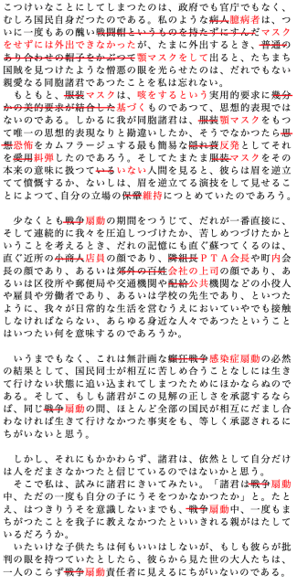 たった数年前、日本は「2週間後はニューヨーク」だの、「42万人死ぬ」だの、「緊急事態宣言」だの、「マンボウ」だの、「15分会話したら濃厚接触者」だの、「ワクチンは95%の効果」だのと扇動されてコロナ騒動に巻き込まれました。アクリルパーテーションで会話しにくい会食があり、自粛とマスクとワクチンを忌避すればまるで非国民扱いの毎日でした。その日常を思い起こしながら、是非80年前の日本人の本質を言い表した文章を読んでいただきたいと思います。