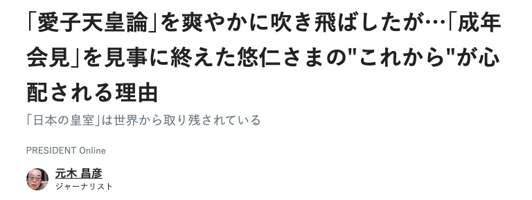 それは、老齢のライターが、18歳の悠仁さまにべったり甘えて放言している姿であり、醜悪な皇族バッシングと全く同根の精神性であると言えるでしょう。