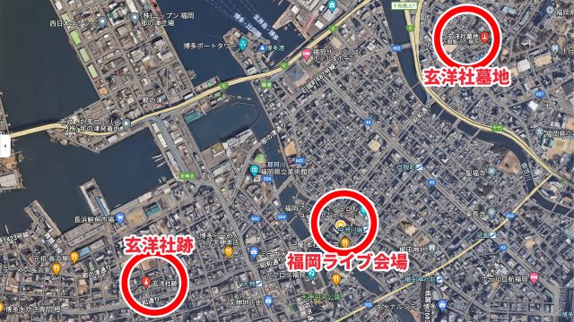 なんと、福岡ライブの会場は、玄洋社跡と、玄洋社墓地のちょうど中間辺りではないですか!「偶然」ながら、これまた良い場所!