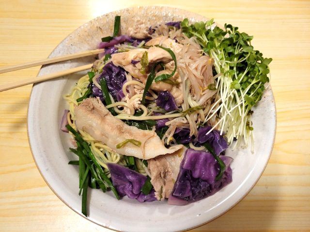 現物見るとかなりデカいのですが、この写真だと小さい(-_-;)。紫キャベツ半分豚バラ200グラムモヤシ1パックソバ3人前ニラ一束。紫キャベツとニラが夏っぽい(・∀・)k。味はかなり美味しかったので、映えないけどよしとしよう。。。