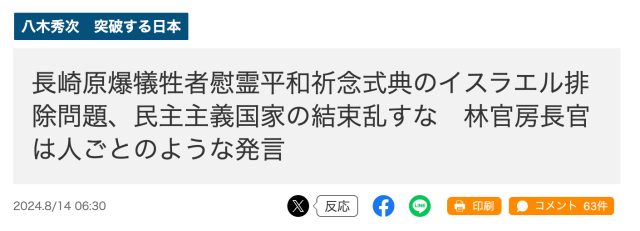 zakzak(産経新聞系のWebメディア)に、八木秀次による「長崎原爆犠牲者慰霊平和祈念式典のイスラエル排除問題、民主主義国家の結束乱すな 林官房長官は人ごとのような発言」という記事が掲載されました。