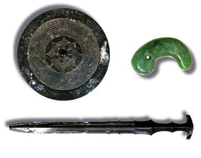 皇室に代々伝わる三種の神器(画像はWikipediaより。この画像をTシャツに印刷して売ったりしたらダメ、ゼッタイ!)。