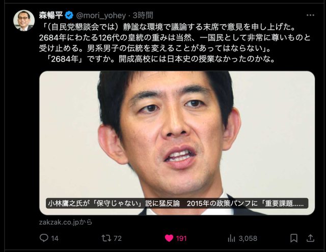 小林氏は党の「安定的な皇位継承の確保に関する懇談会」のメンバーだとしたうえで、「静謐な環境で議論する末席で意見を申し上げた。2684年にわたる126代の皇統の重みは当然、一国民として非常に尊いものと受け止める。『男系男子の伝統』を変えることがあってはならない」と強調した。