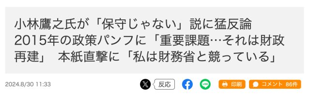 記事の概要は、自民党の総裁選出馬を表明している小林鷹之議員が、過去の言動などから「保守ではない」と批判が出ている事に対して、インタビューで反論するというもの。