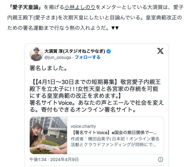 こんなのじゃなく、政治家に愛子天皇論を渡すロビー活動とか、愛子さま祭りとか、もっとガッツリ盛大に関わってるやつがあるでしょう。そうした暗躍(笑)をもっと書いてくれなきゃ。