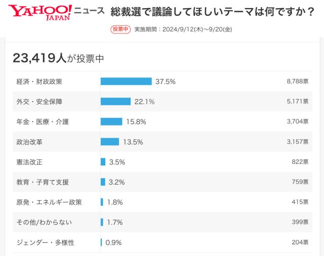 Yahoo! Japanで「総裁選で議論してほしいテーマは何ですか?」という投票をやっているのですが