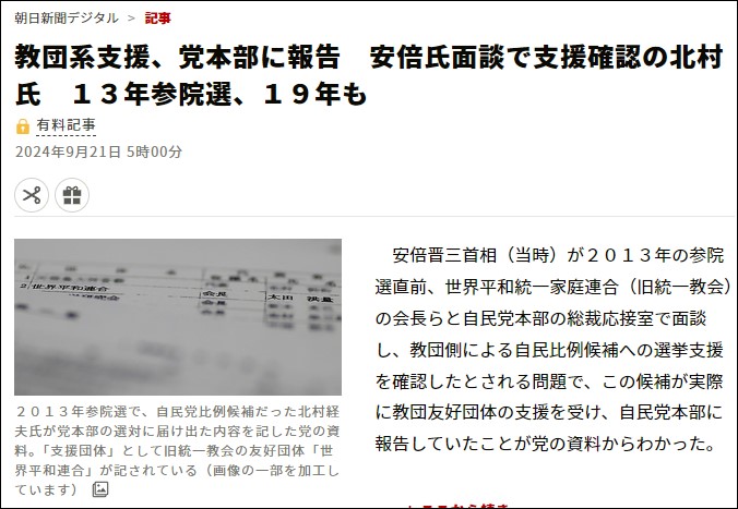 今日の朝刊では、2013年の参院選直前、安倍晋三首相(当時)が統一協会(「世界平和統一家庭連合(旧統一教会)」なんてめんどくさい書き方はしません!)の会長らと自民党本部の総裁応接室で面談、教団側による自民比例候補への選挙支援を確認したとされる問題で、実際に教団友好団体の支援を受けて当選した北村経夫が、その旨を自民党本部に報告していたことが、党の資料からわかったと報道しています!