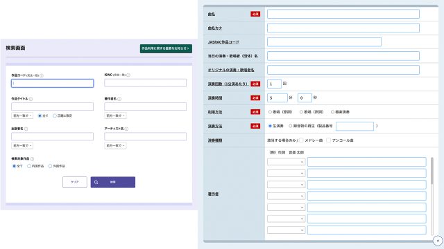 いまは全部オンラインでできるだけまだ良いのですが、同じ組織内なのに楽曲データベースと申請システムが連動しておらず、画面を2つ開いて1項目ずつコピペするという大変人の手の温もりに溢れる操作(笑)が必要となります。