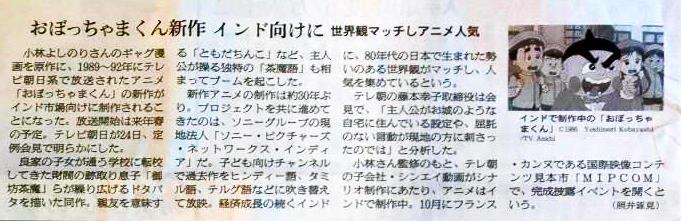 今朝の朝日新聞に『おぼっちゃまくん』新作アニメ記事掲載!