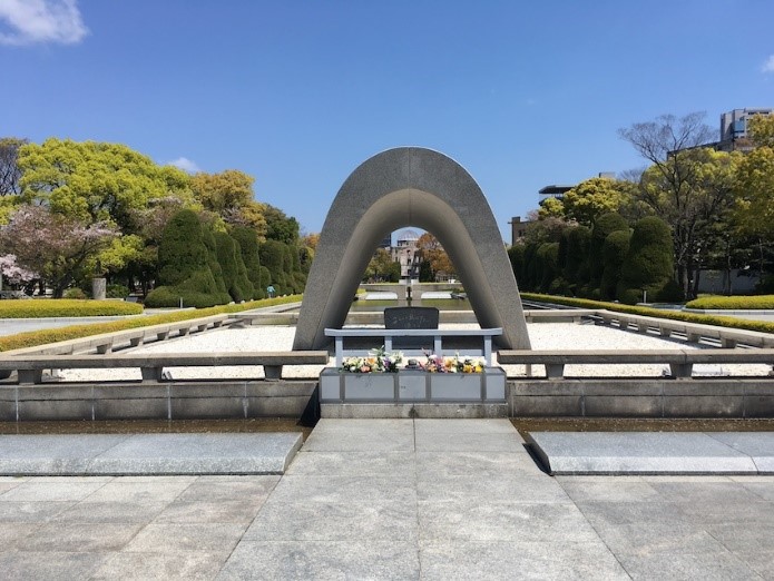 慰霊碑のアーチの奥に「平和の灯」と「原爆ドーム」が見えます。