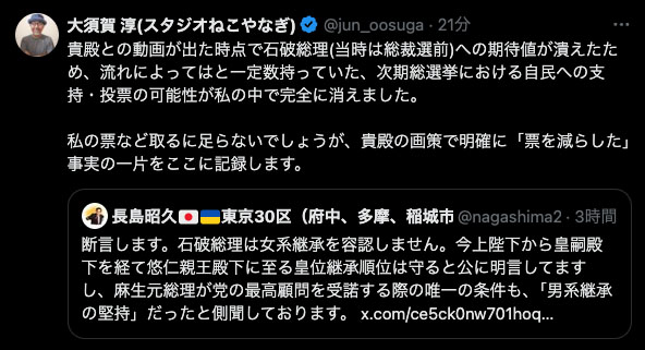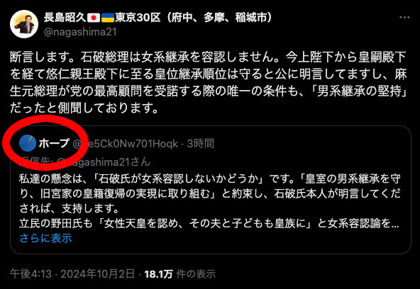 それにしても滑稽なのは、石破内閣の内閣総理大臣補佐官(国家安全保障に関する重要政策及び核軍縮・不拡散問題担当)である長島昭久が、あらゆるトンデモ説を唱える(しまいには、アンケート改竄の不正行為を共に助長した)竹内久美子と同じXユーザーに反応し、「側聞」と断ってはいるものの、麻生最高顧問の就任は男系堅持が条件だったという話を、ぺーらぺらと得意げに話してます。