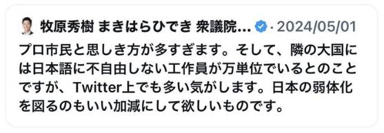 私は石破内閣での入閣まで牧原秀樹という人を存じませんでしたが、就任直後に一部でピックアップされていた下記のポストなどを見て