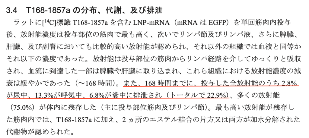 こういう時に抑えるべきは事実の確認で、まずレプリコンでなくてもmRNA成分は他人に伝播します。佐野教授の研究でワクチン由来のスパイクが汗腺で見つかっていますから、ワクチン成分が体外に放出されるのは確実です※①。第一三共のラット実験でもmRNA製剤は呼気や糞便で排出されたとあります※②。ちなみにラットは汗をかきませんから、そういう意味でもラット実験だけでは不十分という主張は妥当なものです。