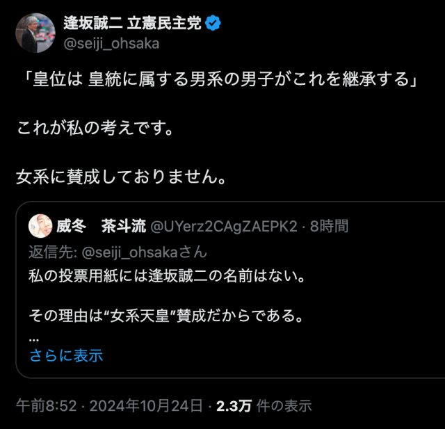念の為、元の「投票しません」への返答は、選挙活動開始時間後の8時12分投稿ですが、逢坂候補のアカウントはたったの40分後に「女系賛成ではない」と返しています。