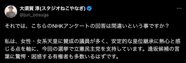 そして、Xをやっていない人がNHKや日テレのサイトだけを見て「逢坂候補は女性天皇賛成なんだな」と判断して投票したら、虚偽の情報で投票に誘導した事になってしまいます。