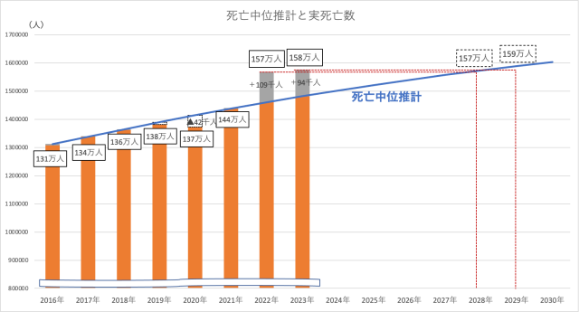 <表>のように2019年までは予測通りだった死亡数はコロナに怯えた2020年に過少となりましたが、ワクチンの始まった2021年に増加に転じ、2022年、2023年の死亡はそれぞれ10万人前後の超過となりました。ちなみに今年2024年の速報値も2023年を上回るレベルで死んでおり※⑤、「超過死亡の翌年は過少死亡」という当然の理屈さえ成り立っていません。日本は2022年から一気に多死社会になったのです。