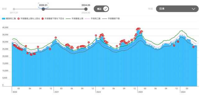 2023年は2022年より1万人ほど死亡が増加しましたが、最近超過死亡の話題は下火で、そもそも超過死亡ダッシュボードでは超過が出ていません※②。死亡が増えたのに超過死亡とならないのはなぜでしょうか?