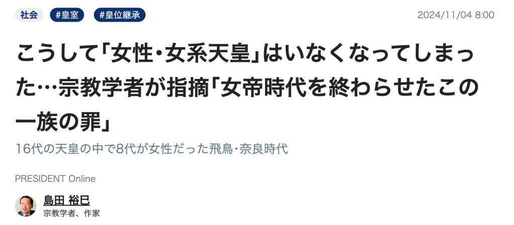 プレジデント・オンラインに掲載された、島田裕巳氏による「こうして『女性・女系天皇』はいなくなってしまった…宗教学者が指摘「女帝時代を終わらせたこの一族の罪」大変重要な内容が、充実しながらも読みやすい量で記されています。