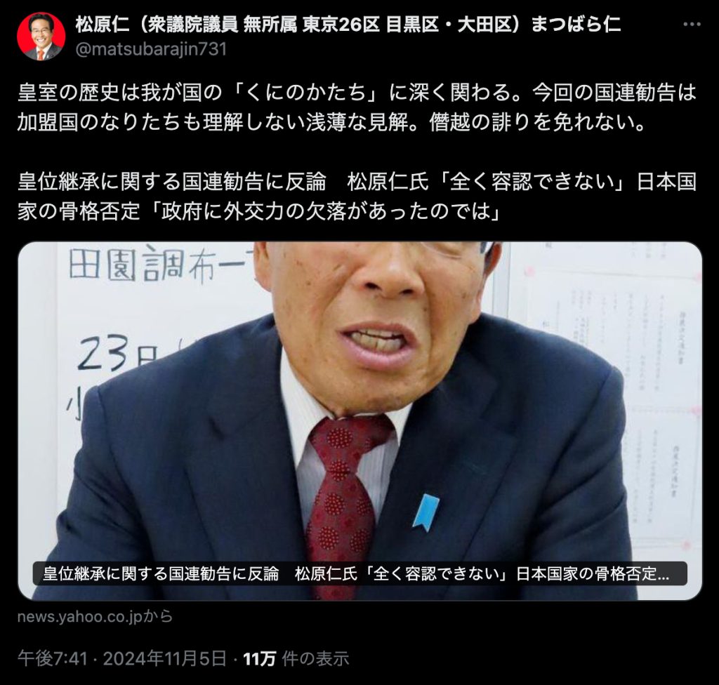 ここ数日猛批判を浴びている、松原仁・衆議院議員の夕刊フジ記事およびXへのポスト。
