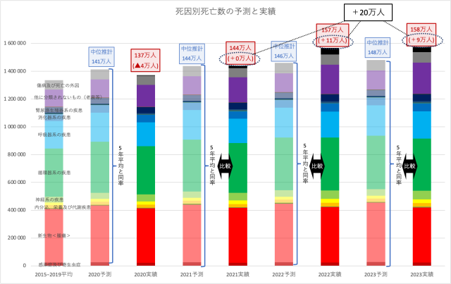 意外だったのは癌死亡で、予測数値に対して7万人少ない数字です。しかし癌は数十年かけて進行する病ですから今後も注視が必要です。