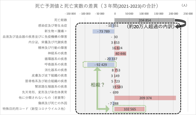 次に多いのは「特殊目的用コード」で殆どがコロナ死です。当然予測値のない死因で約10万人の純増ですが、ここで注目したいのは呼吸器系の疾患で、インフルや肺炎などの合計が予測より9万人減です。コロナは呼吸器系の疾患ですが、これは従来の呼吸器系疾患死がコロナ死に付け変わっただけではないでしょうか?