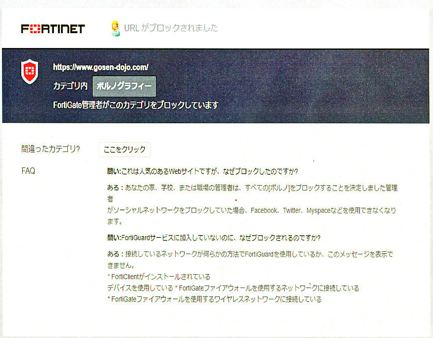 勤務先のパソコンは「フォーティネット」というサイバーセキュリティを導入していて、3月までは普通に閲覧できていたということですが、これがなぜだか4月に入ったら、ゴー宣DOJOホームページを「ポルノグラフィー」のカテゴリに分類して、ブロックするようになってしまったというのです。