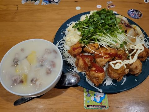 唐揚げが半額だったので二パックいれたよ!味噌汁がわりにホワイトシチューの残りも。。。