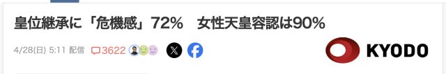 もうご覧になっている方も多いと思いますが、共同通信が行った世論調査で、女性天皇を認めることに計90%が賛同という結果が発表されました。