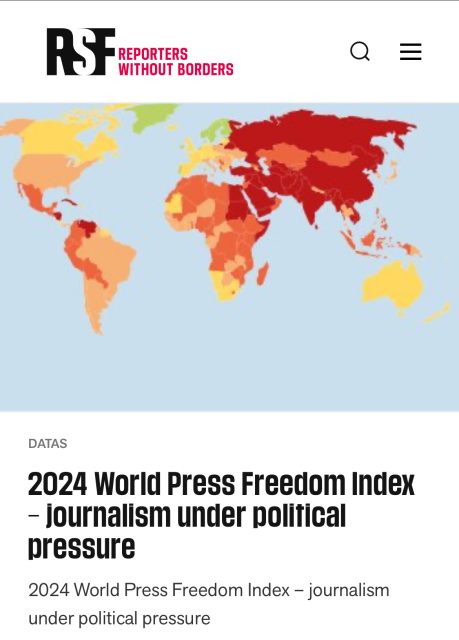 「国境なき記者団」が発表した、2024年版「報道の自由度ランキング」で、日本はG7の中で最下位となる70位(一位はノルウェー。最下位の180位は「独立した報道機関が存在しない一党独裁国家」のアフリカ・エリトリア)。
