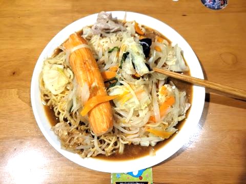 ヤキソバ1玉、もやしパック1個、キャベツパック1個、特大カニカマ2個、生卵2個、いちおう国産豚肉1パック(100g)。味付けは、附属の粉ソースを1つにして、普通のブルドックソースと万能だしを少々いれるのが工夫。これで普通の味になる(・ω・)