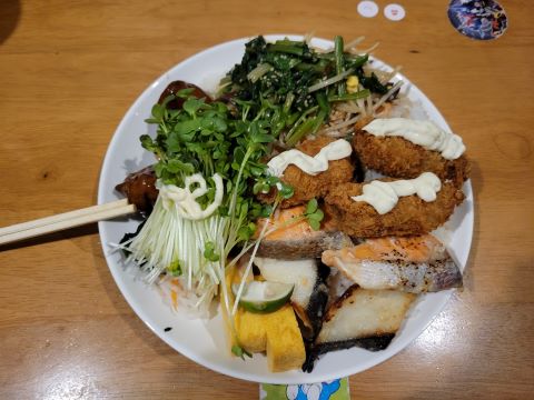 肉団子(3個入り)牡蠣フライ(3個入り)ナムルパック(大)焼き魚パック(大)と、いつものカイワレ大根です。大皿に炊いといたご飯(1.5合)を盛って、その上にお惣菜を並べたら、なかなか豪華(・∀・)! しかもウマウマウマオ!