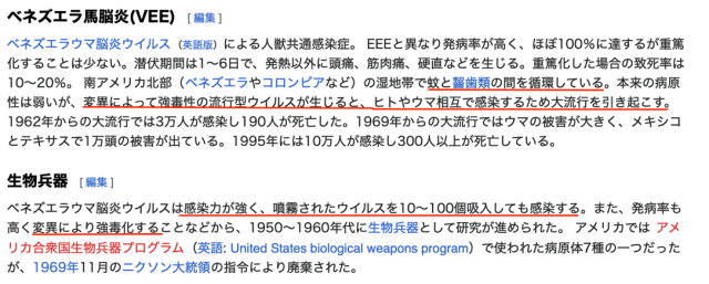 ※③)東部馬脳炎(wikipedia 後段にベネズエラ馬脳炎ウイルスの記載)