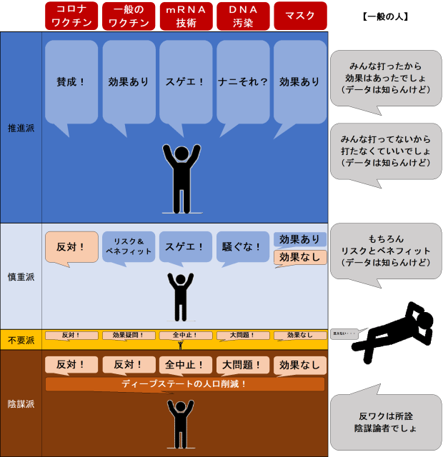 陰謀論の言説は旧シリーズ㊱のビル・ゲイツの人口削減の他に、国家を超越したディープステートなる存在がワクチンの中にナノチップを入れて我々を監視するなどバラエティに富んでいます。しかし面倒なのはDNA混入や接種後死亡などの明確な事実と陰謀論が十把一絡げにされ、政府やマスコミもまた陰謀論への攻撃の裏で明確な事実を巧妙に隠していることです。不要派からすれば陰謀派も大事な反ワク勢力ですが、それでもやはり荒唐無稽な言説を支持することは出来ません※①②。