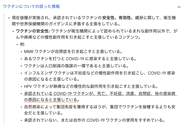 ポリシーをチェックしますと「承認されているワクチンの安全性、有効性、成分に関して、衛生機関や世界保健機関のガイダンスに矛盾する主張をしている」と違反であり、例として「承認されている COVID-19 ワクチンが、死亡、不妊症、流産、自閉症、他の感染病の原因になると主張」とあります※③。要するに大本営発表以外はデマということでしょうが、他ならぬ厚労省が発表した接種後死亡認定は史上最大の668人に上っているのですから、全くもって意味不明です※④。