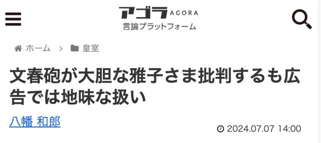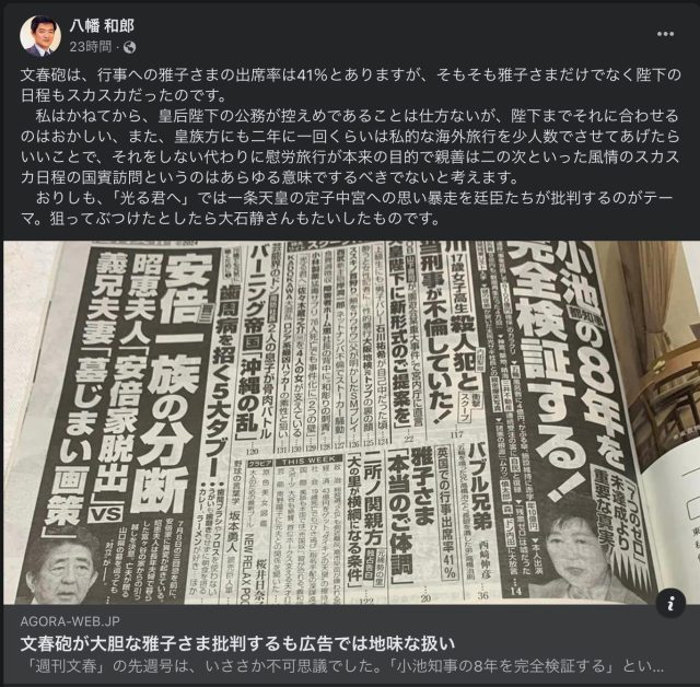 その文春が掲載した新たなバッシング記事に、八幡和郎が喜々としてSNSで反応し、「私はかねてから〜」と得意の御高説。