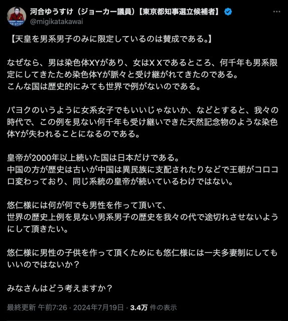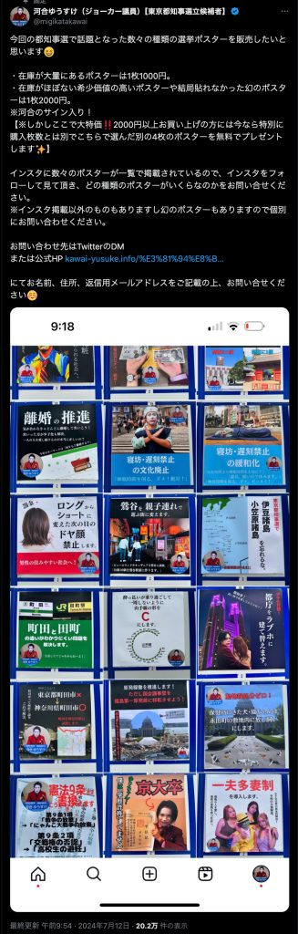 「令和の百鬼夜行」の様相を呈していた都知事選候補の中でも、ビジュアル面で最も妖怪っぽかった河合ゆうすけ・元草加市議会議員(ジョーカーの仮装で、ほぼ全裸の女性を印刷したポスターを掲示した候補)が、Xに次のような一文をポストしていました。