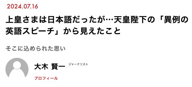 「現代ビジネス」に、ジャーナリストの大木賢一氏による、天皇陛下訪英時のスピーチについての考察を軸とした記事が掲載されています。
