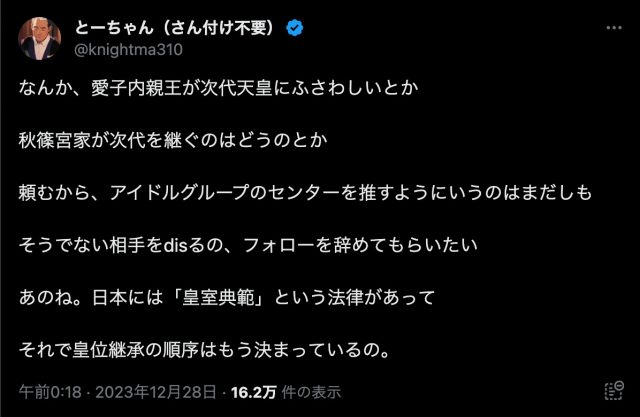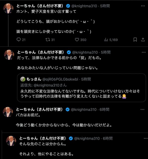先に挙げた一部の悪態ほかのスタンスを見る限り、自身の承認欲求を満たすための皇室ウンチクには熱心でも、安定した皇位継承が実現し、皇室と国民の幸福な関係が未来に渡って続く事にはとんと無関心(というスタンス)のようです。