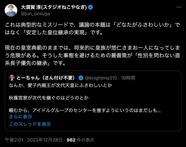 一見ざっくばらんとしたような語り口で、男系男子固執では皇族が悠仁さまだけになり継承が危機的な状況になる可能性が高いという皇位継承問題の本質から目をそらさせて「人気投票的な流れは愚か」という印象に誘導する。