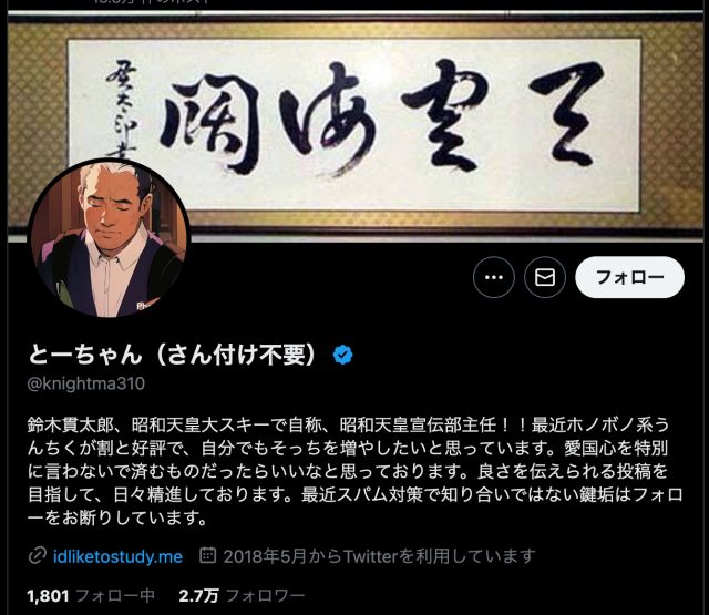 この「とーちゃん」氏( https://twitter.com/knightma310 )は、特に昭和天皇に関する「ちょっと良い話」的な投稿で一定の支持を集めているようですが