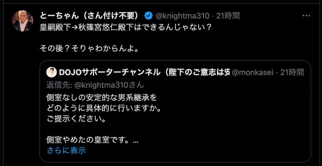 当人が皇室の未来に無関心(を装い、男系固執)な事は愚かとは思いつつ勝手ですが、昼行灯的な達観者を装いながら、異論者に対しての罵倒や揶揄は平気で行います。