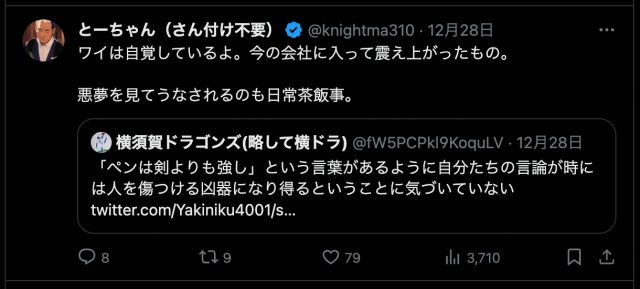 「とーちゃん(さん付け不要)」氏は、面倒な者に絡まれた的な体で、このように発言します。