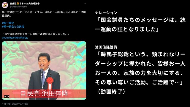 現在、Xでは、池田議員が統一協会のイベントで熱を込めてスピーチしている動画が拡散しています。