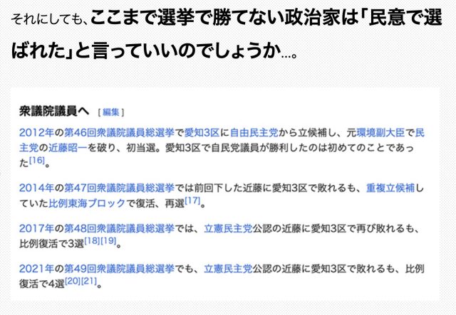 これだけ、有権者には直接「選ばれない」事を繰り返しても、党内の有力者・派閥に取り入ると、しまいには逮捕されるまで国会議員でいられるのか…と、素直な驚愕で書きました。