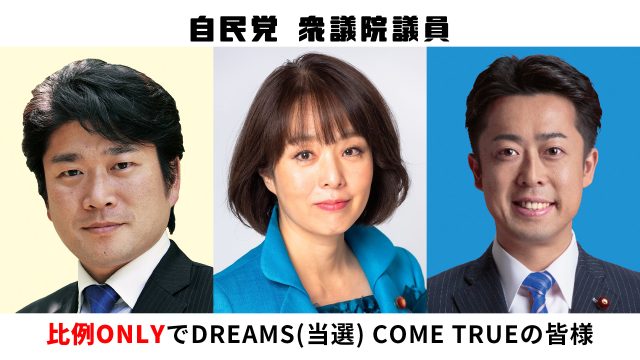 ちょっと、自力では全然票をとれないけど、比例オンリーで「当選」というDREAMSをCOME TRUEしたお三人に並んでもらいましょう。照れないでこっち向いて。